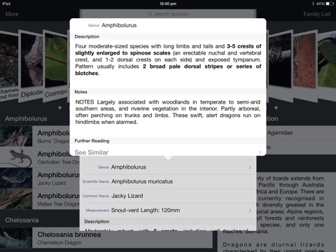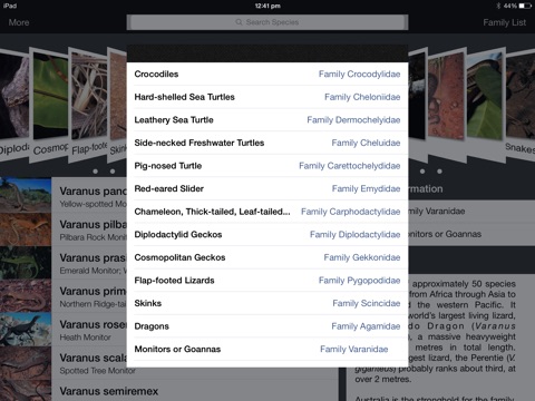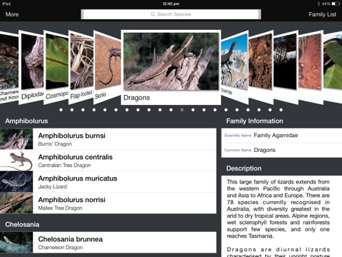 With the unique cascading family selection and intuitive search this reptiles app will allow anyone from beginner to expert to find what they are looking for. We developed this one of a kind app to enable people to explore and discover the wide and varying world of reptiles. While delivering and insane amount of detailed information.