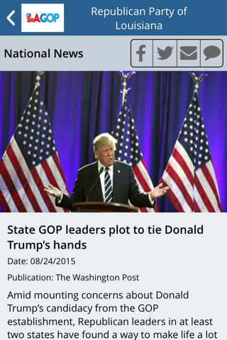 Download the Republican Party of Louisiana app for iPhone today to stay informed about, and contribute to, the national political landscape. The simple and easy to use layout is perfect for remaining in touch with breaking news and events as they happen. And unlike never before the powerful poll and survey functions enables you to participate directly in the formulation of public policy by letting you vote and contribute your opinion on all key issues both in and out of election cycles. The app even lets you see the results as they are counted.