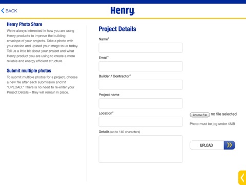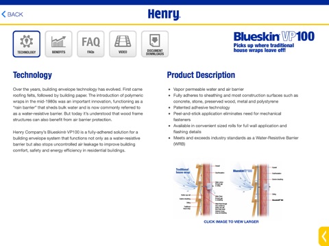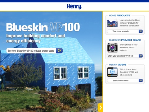 The Henry Residential Building Envelope app is an easy and quick way to access Henry’s complete offering of residential building envelope solutions. This easy-to-use app offers detailed information, visuals and videos on Henry’s industry leading product Blueskin VP100. Additionally, an interactive illustration highlights all of Henry’s residential solutions so you can access product information, videos and downloadable literature. A Project Share feature built into the app also allows you to photograph your project that is using Henry products and share with Henry from anywhere! Download it today and begin to explore how Henry residential building solutions can make a more comfortable, energy efficient home.
