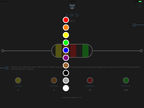 Resistor Color Coder simplifies resistor calculations with an intuitive user interface and bright colors. It is perfect for engineers, students, and teachers. Now, color code charts are a thing of the past!