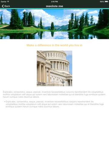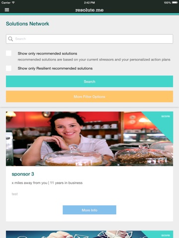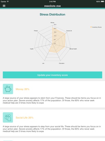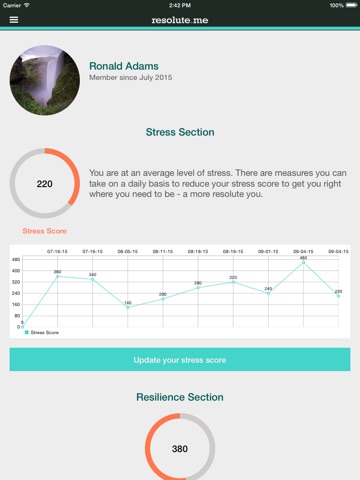 Whether we like it or not, stress is an ever-present and unavoidable part of our daily lives. The difference between winning and losing your battle with stress is all about putting things in perspective. The Resolute.me app helps you take control of your life by analyzing your stress score and providing you with a Resilience profile. Together, we can make a more resolute you.