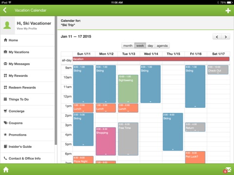 •Plan your vacation with our customized vacation calendar. Looking for an efficient way to coordinate everyone with whom youre traveling? Our vacation calendar allows you to plan out each and every day of your trip and is even integrated with local events in Breckenridge. Use the color-coordinated event tabs to denote meal times after a round of golf, or simply mark the whole day as a beach day.