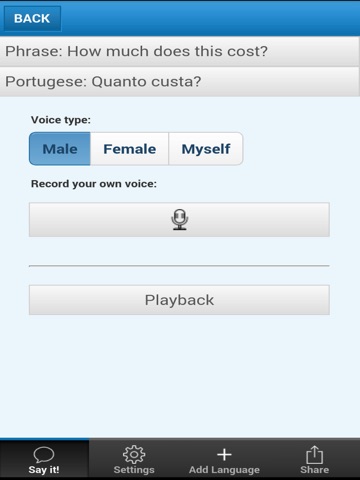 Enable the desired language package before heading to your vacation or business destination. Playback the translated phrases when you need them, even when your phone is off-line.