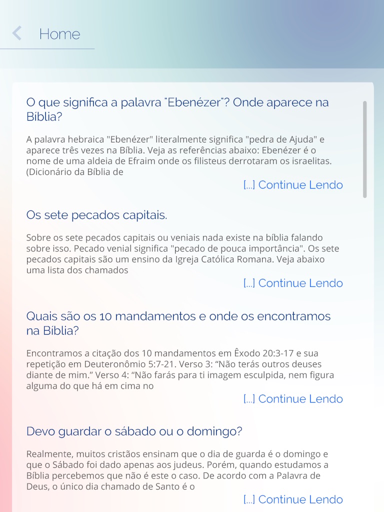 Durante muitos anos a Escola Bíblica da Novo Tempo tem recebido perguntas de pessoas interessadas em conhecer mais sobre a Bíblia e o que esse livro diz sobre vários aspectos da vida diária. Esse aplicativo reúne um acervo de mais de 2000 respostas e você poderá acessar facilmente digitando o tema ou palavra-chave.