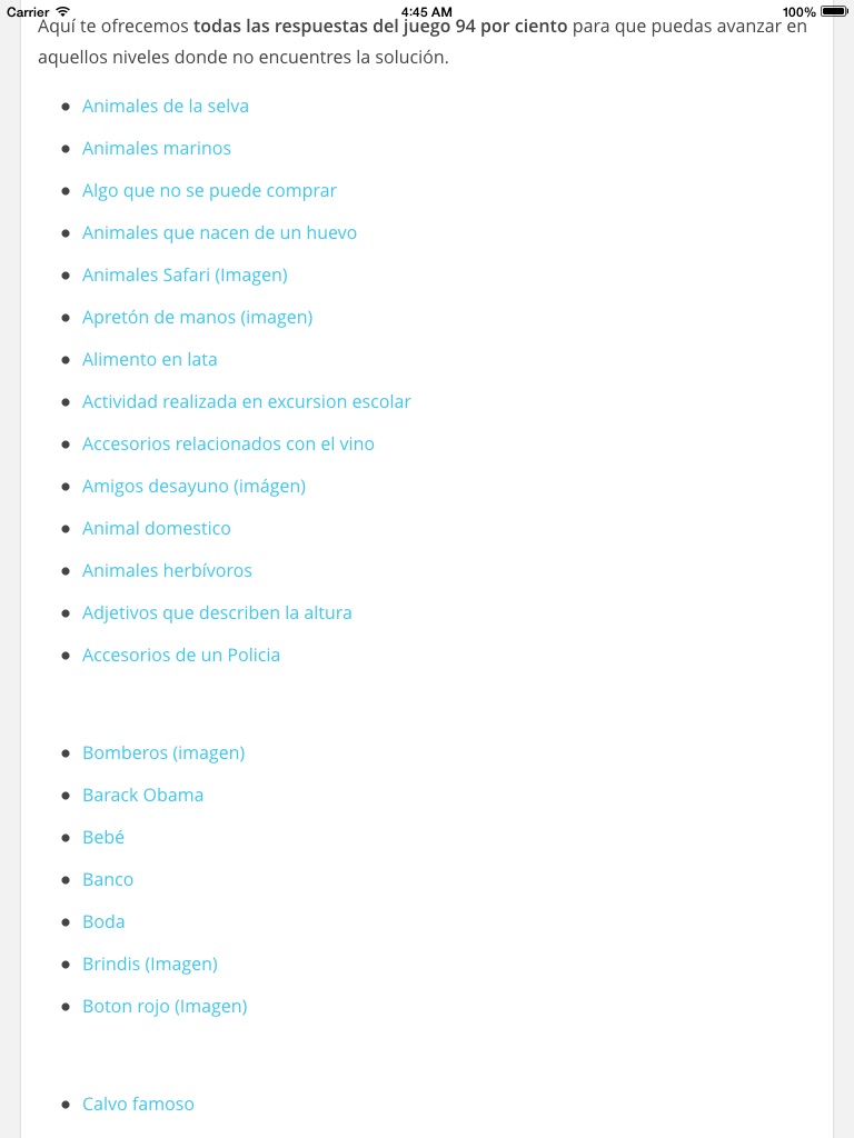 En esta aplicación encontrarás todas las respuestas para el juego 94%. La misma brinda las soluciones ordenadas en orden alfabético de forma que puedas encontrarlas más fácilmente, ya que el orden de los niveles de 94 por ciento son distintos en diferentes dispositivos.