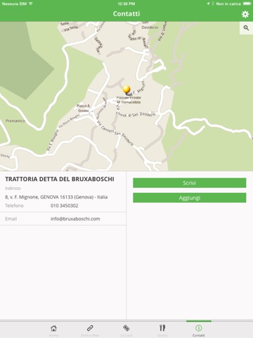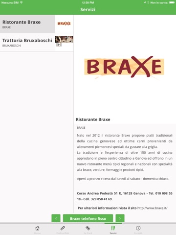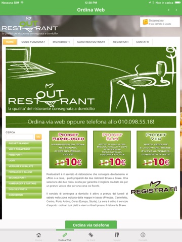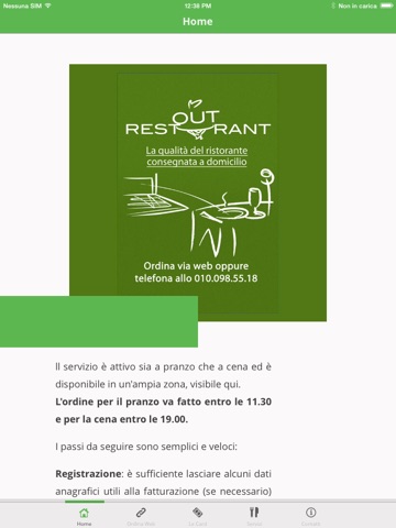 Allinterno di questa applicazione è attivo il collegamento al sito internet, in cui trovare le indicazioni su come poter effettuare la prenotazione; una breve descrizione dei due ristoranti genovesi che si occupano della preparazione dei piatti; e lelenco delle card restoutrant da poter utilizzare per fare acquisti online.