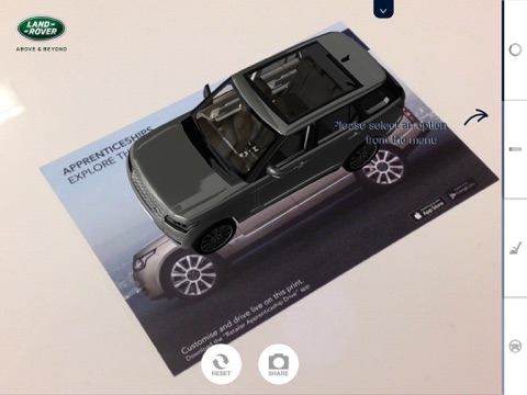 Having created world beating, truly iconic 4x4’s for over 60 years, Land Rover retailers require more staff to join its expanding workforce. The Apprentice Programme develops the best talented young people to handle every eventuality. Your Land Rover journey begins here! Print the marker from http://landroverdealerapprenticeships.com/arapp.aspx, download the app to your smart device and point your phone or tablet camera at it. Find your way around a Range Rover in amazing augmented reality. Personalise your vehicle, take an x-ray look inside and even take it for a test drive but don’t forget to watch for the obstacles along the way.