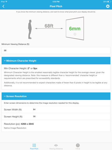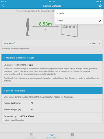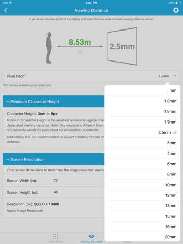 Specifically, this calculator will help you determine the best viewing distance for a given pixel pitch, or conversely, the best pixel pitch for a given viewing distance.
