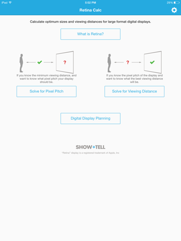 Large-format, L.E.D. video wall displays are becoming widely used to create dynamic spaces. Retina Calc helps retail, architectural and environmental designers better understand the relationship between viewing distance, pixel pitch, and perceived image quality.