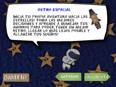 Retiro Espacial, es un simple pero divertido juego en el que los niños experimentaran como es que funcionan las inversiones y el ahorro, todo esto con un ameno y entretenido juego, en el que el objetivo es construir el mejor cohete para que llegue lo mas lejos hacia el espacio.