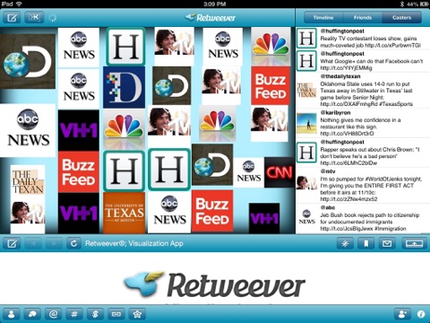 Visually dynamic and highly interactive, Retweever™ streamlines your Twitter viewing by finding the interesting tweets. Retweever categorizes your tweet-stream as it downloads; you see what’s important to you first. The Retweever Avatar Map presents Twitter conversations and messages in clear popovers. The Avatars scale with their relevance and timeliness to the ongoing twitter conversation. It’s eye-catching. It’s informative. It’s useful.