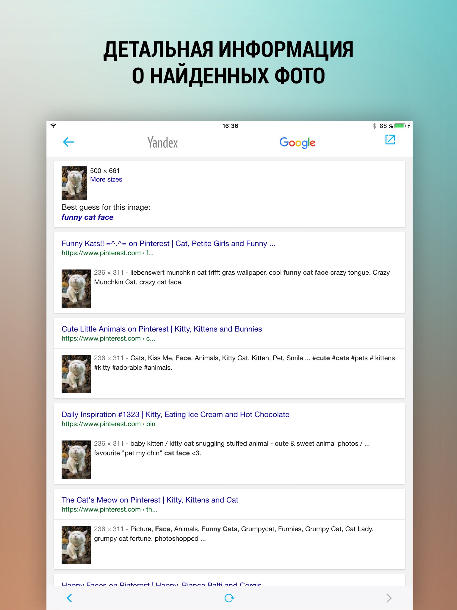 No need to search for photos by desciption when you can use reverse photo search! Make a photo or select one from your Camera roll and let the app find all the similar images on the web. If you need a photo of certain size, just set the parameters before the search. It was never that easy. Start searching!