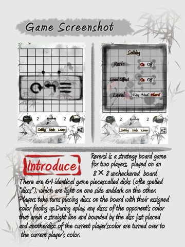 Reversi is a strategy board game for two players, played on an 8×8 uncheckered board. There are sixty-four identical game pieces called disks (often spelled "discs"), which are light on one side and dark on the other. Players take turns placing discs on the board with their assigned color facing up. During a play, any discs of the opponents color that are in a straight line and bounded by the disc just placed and another disc of the current players color are turned over to the current players color.