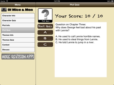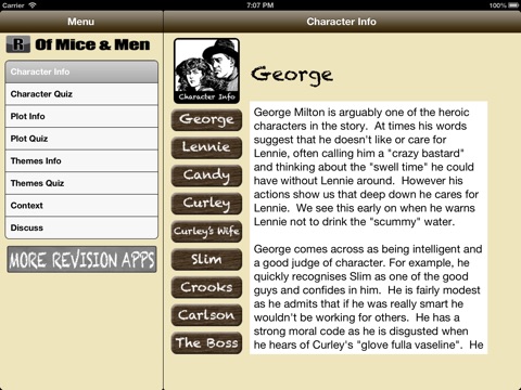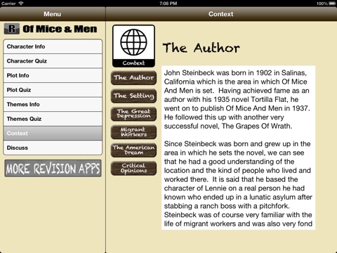 This revision application is aimed at those who have been studying Steinbecks Of Mice and Men. It includes detailed summaries of characters, themes, context and plot as well as several interactive quizzes to test your knowledge of the text. It is simple and intuitive to navigate around and is optimised for both iPhone/iPod Touch and iPad. Studying on the go has never been easier!