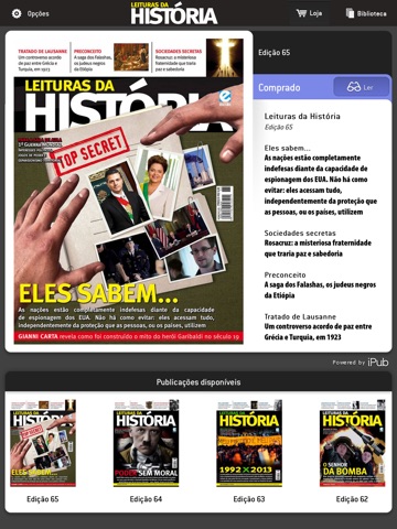 Mergulhe em todas as facetas que a História oferece. A revista Leituras da História apresenta os fatos históricos por meio de uma abordagem analítica e não apenas descritiva. Mistura análise a curiosidades, sob o crivo de nomes como Maria Helena Capelato (USP) e Ivan Rocha (Unesp), entre outros membros de peso em seu conselho editorial. Traz seções exclusivas como Direto da Fonte, com registros originais de historiadores, e Testemunha Ocular, com depoimentos de agentes e espectadores de importantes acontecimentos.