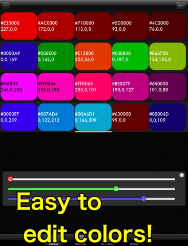 When the code/number on a palette is tapped, the color editor will be shown. You can change the RGB color using their sliders.