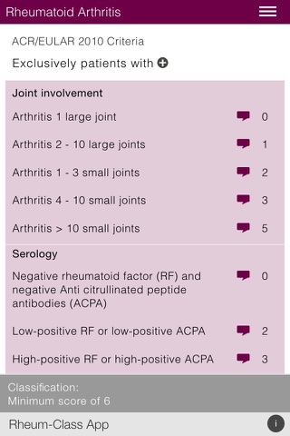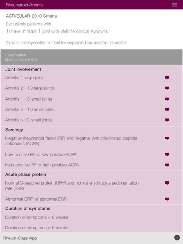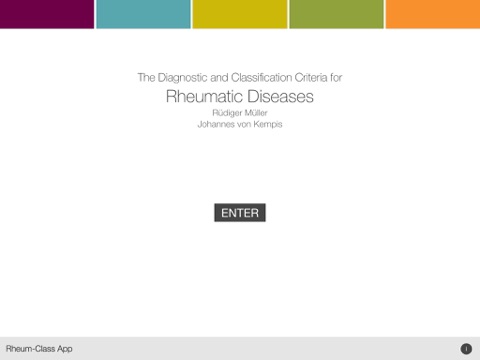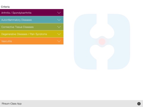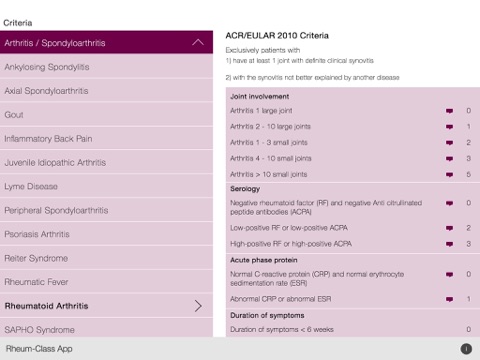 Who does not recognize the difficulty to get and keep a comprehensive overview of all the diagnostic and classification criteria in rheumatology. Many sets have been newly published or older ones updated over the last years. In the era of evidence based medicine, it is important to have them ready at hand at all times. This App aims at closing the gap between publication of the criteria and having them available directly and provides them in a compact, comprehensive and mobile way.