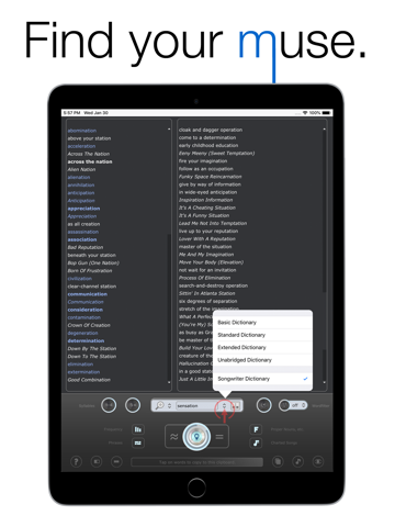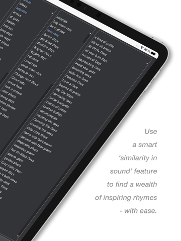 Get inspired by over 330,000 entries, 30 different rhyme types and one of the largest collections of American sayings, clichés, idioms and hit song titles. Enjoy Rhyme Genie’s 10 million phonetic references, automatic detection of stressed syllables, true multi‑syllabic rhymes and intuitive control over the ‘similarity in sound’ between search words and rhyme mates.