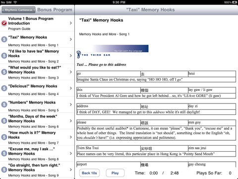 The 99c version of this app includes the first two songs from Rhythmic Cantonese Volume 1, and the first “Memory Hook” track. It also includes a bonus program of selected highlights from our book "The Third Ear - You Can Learn Any Language". The remaining 12 songs from Rhythmic Cantonese Volume 1, and all of the tracks from Volumes 2 & 3, are available via In-App Purchase.