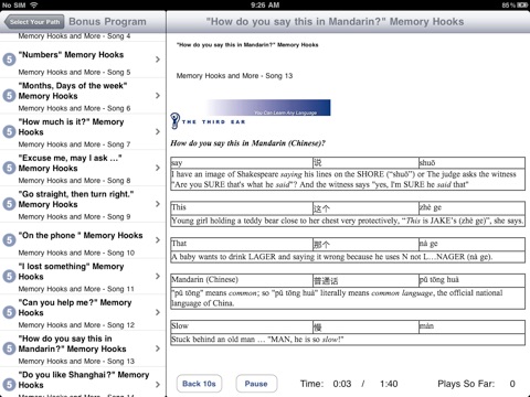 - You also get a bonus program featuring podcast-style tracks of "Memory Hooks" (word plays and word associations) to help you remember the new Mandarin Chinese sounds.