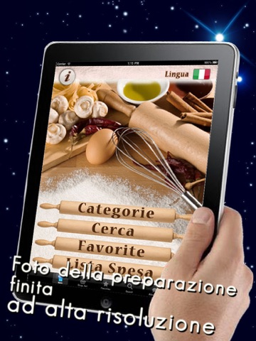 Each recipe is accompanied by a picture of the finished preparation in high resolution. Categorization: Appetizers, soups and hot soup, first course (pasta and timbales), meat, fish, fried and fried vegetables, dessert (sweet and savory pizzas.) For each recipe you will find: title, category, difficulty, preparation time, cooking time, recommended wine (where Reviewed), details of ingredients, preparation of text, image + high resolution icon.