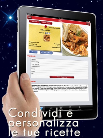 You can by clicking add ingredients to shopping list and check just as you are at the supermarket, so do not forget anything! And theres more, other features of the service are: the chance to put the recipes in the library, to find a dish by name, ingredients or preparation. You can also change the recipe in every aspect, from the description to the title, from ingredients to personal notes. You can also enter new or change the image if you have cooked the dish you want to replace that system with your dish prepared! All this along with dozens of other features all included in the first of the new series traditional regional recipes.