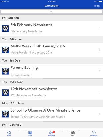 Shows all the latest stories from your school or organisation. If you tap on any news item you will be able to see more detail.