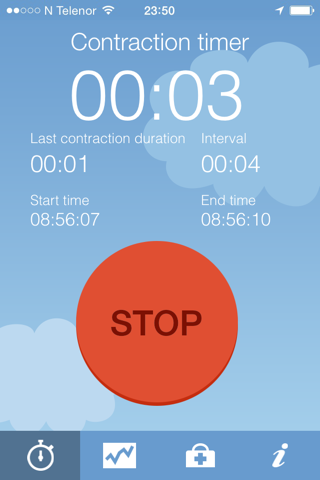 With the contraction timer you can easily keep count of the contactions before childbirth. Just press the green start button when a contraction start and the red stop button when the contraction ends.