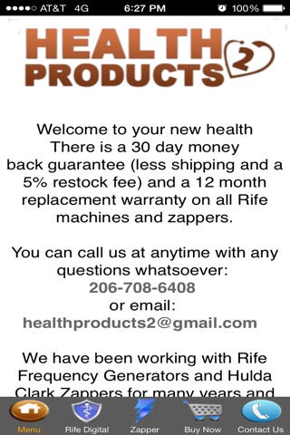 There is a 30 day money back guarentee (less shipping and a 5% restock fee) and a 12 month replacement warrenty on all Rife machines and zappers.