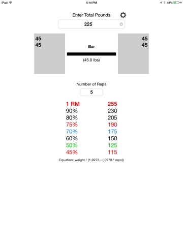 Also, Right Plates calculates your estimated 1 Rep Maximum and displays percentages of 1 Rep Max for easy reference.