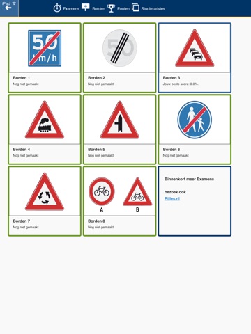 Oefen de verkeerstheorie voor het officiële CBR examen. Je kan onbeperkt examens oefenen, de door jou gemaakte fouten bekijken en zien in welke examencategorie je goed of juist slecht scoort. De vragen zijn up-to-date en voldoen aan de inhoud van het officiële CBR examen. Naast examenvragen kun je ook jouw kennis van de de Nederlandse verkeersborden toetsen.