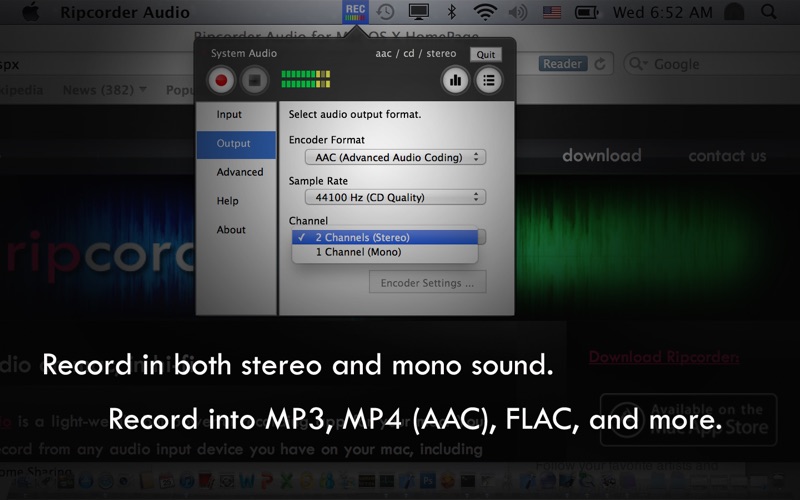Ripcorder Audio is designed to maintain best audio quality while providing various audio compression options. You can use Ripcorder Audio to record directly into common format such as MP3 (constant bit rate, and variable bit rate), AAC, Apple Lossless, PCM, FLAC, etc.