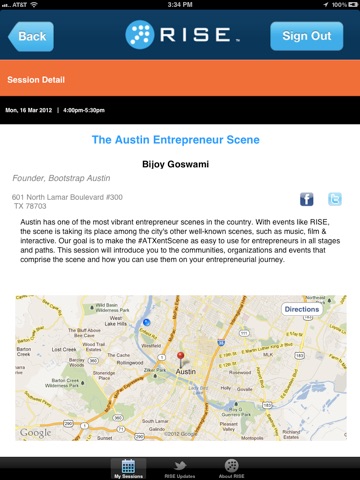 RISE Global Mobile App provides members of RISE the ability to display a list on their iPhone or iPad of the future events/sessions they registered for on the riseglobal.org website. The details of the sessions include time, place and description of the event. Google directions to the venue are available. Social networking based on the RISE session basis is supported through Facebook and Twitter.