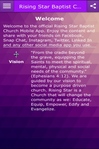 We are guided by our vision to become a purpose driven church. Rising Star is a church that will change the community as we: Educate, Equip, Empower, Edify and Evangelize.