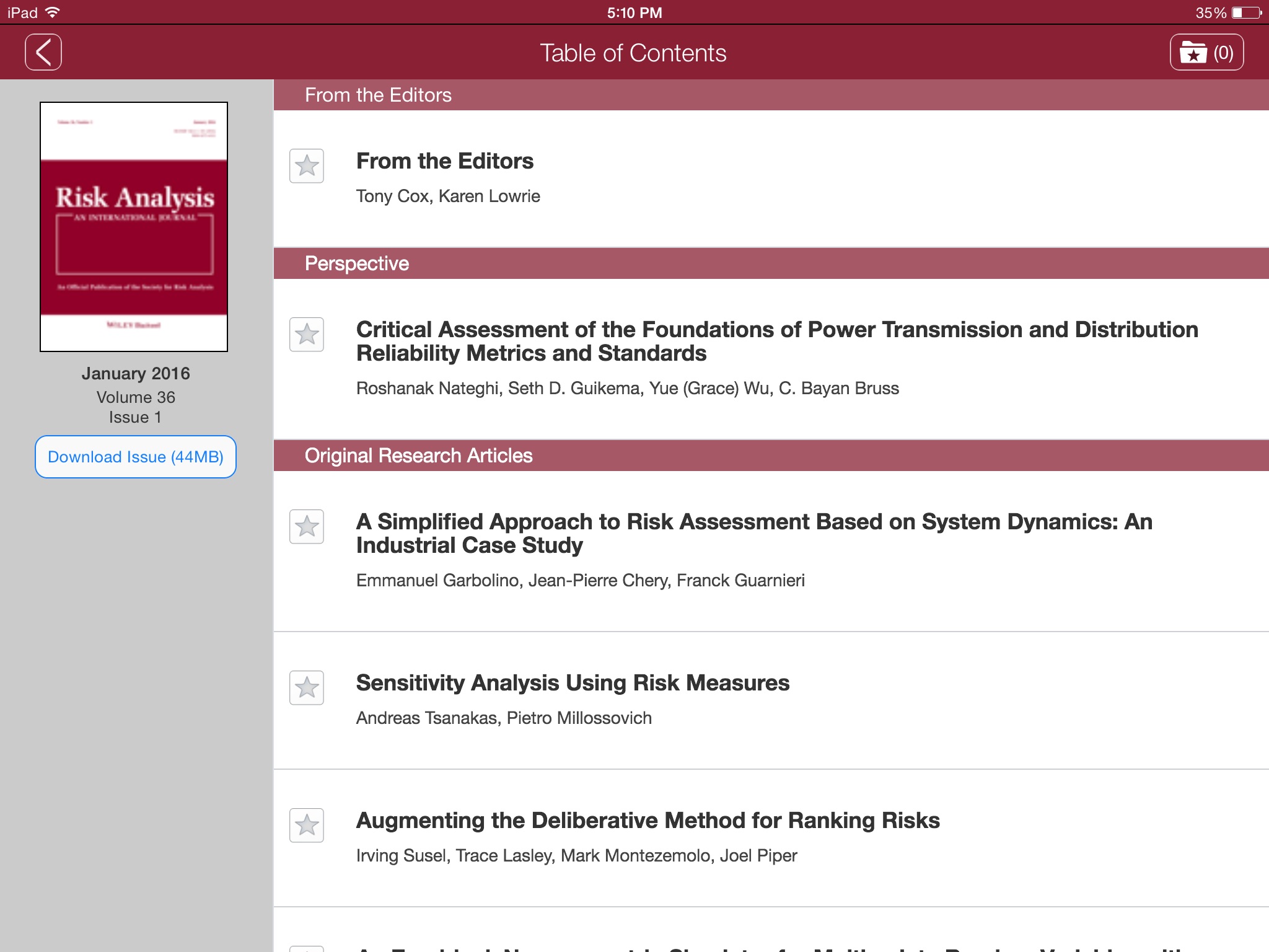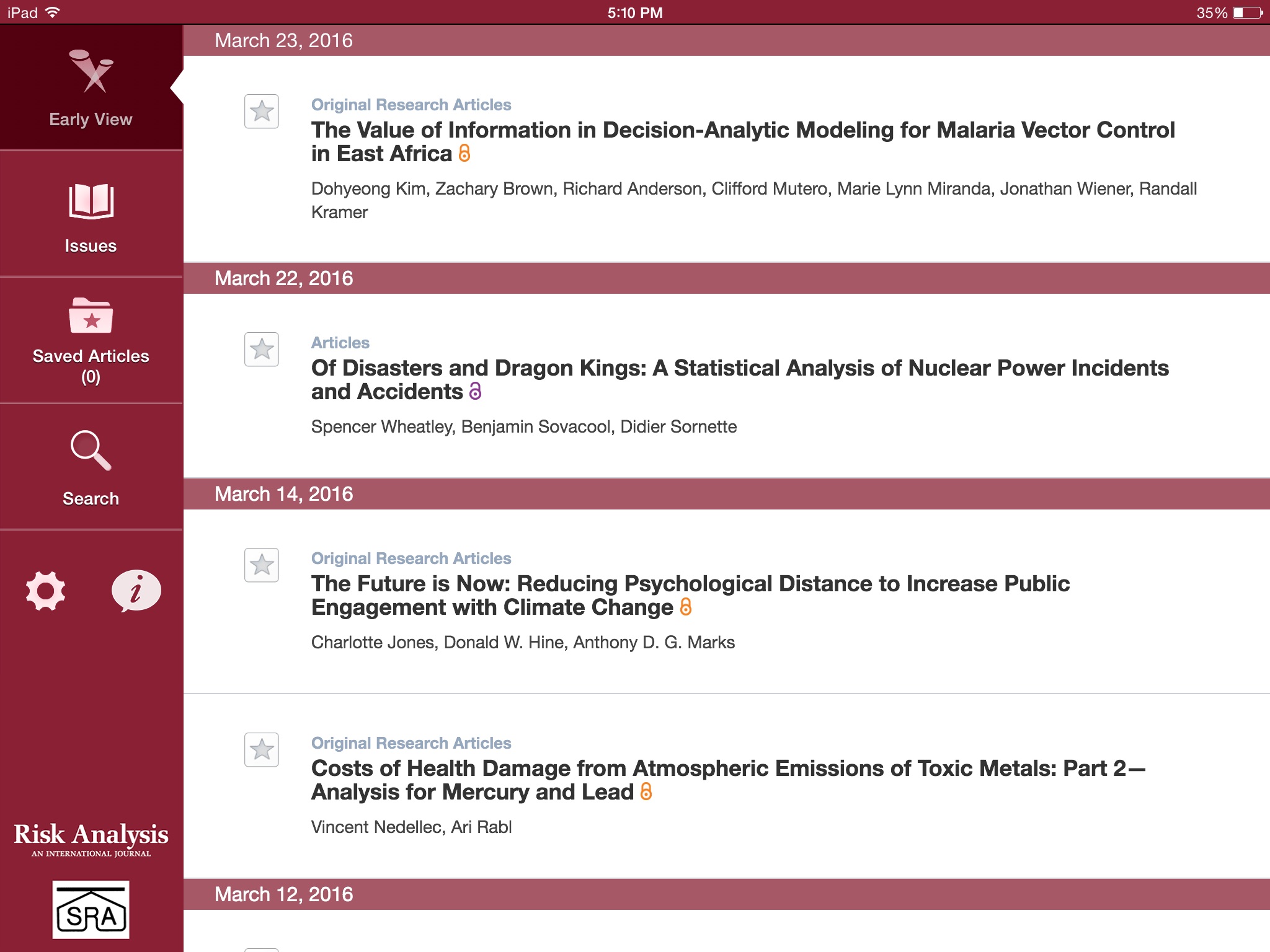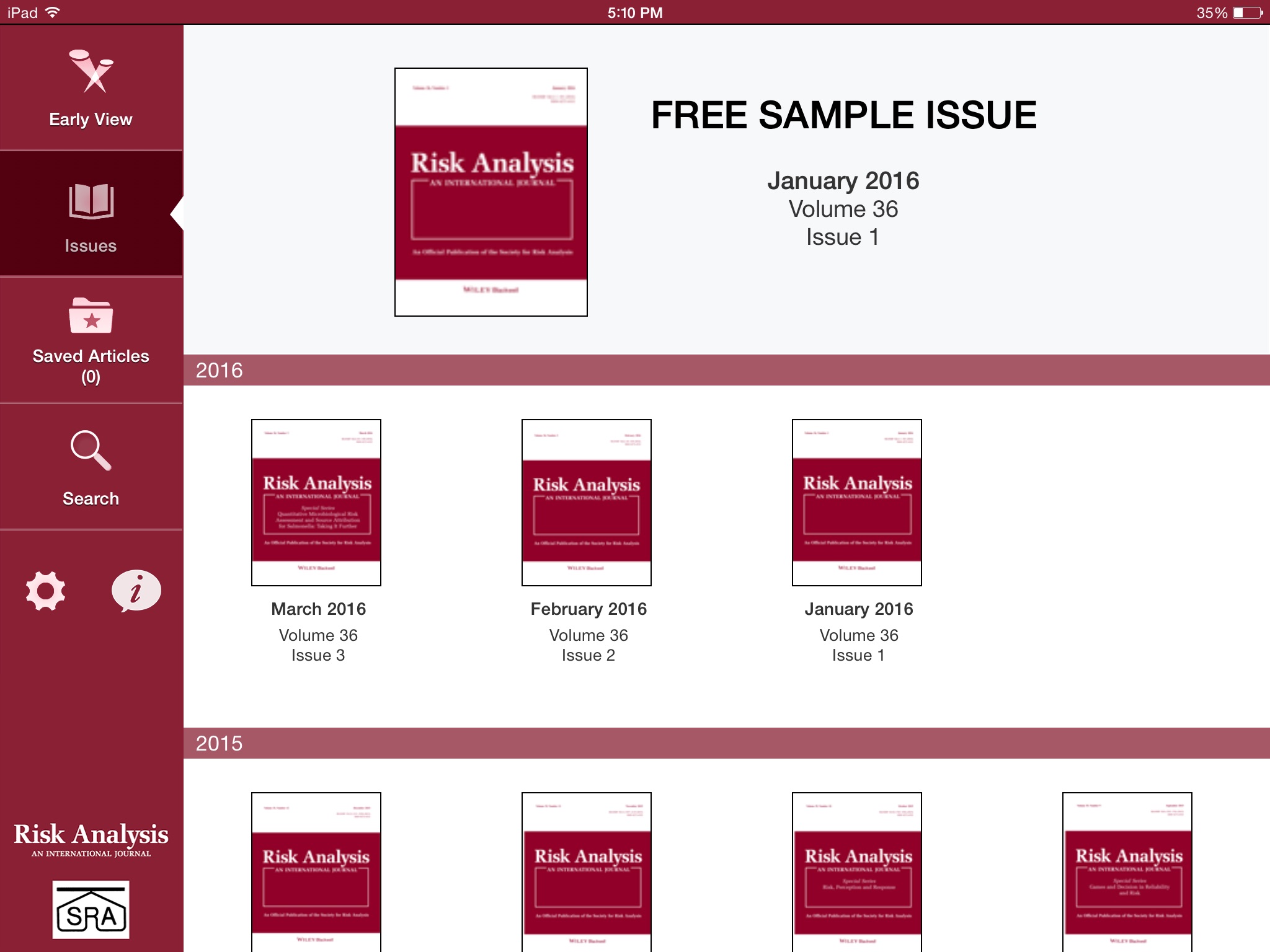 The Risk Analysis App is now available on your iPad and iPhone. Published on behalf of the Society for Risk Analysis, Risk Analysis is ranked among the top 10 journals in the ISI Journal Citation Reports under the social sciences, mathematical methods category, and provides a focal point for new developments in the field of risk analysis. The journal is committed to publishing critical empirical research and commentaries dealing with risk issues.