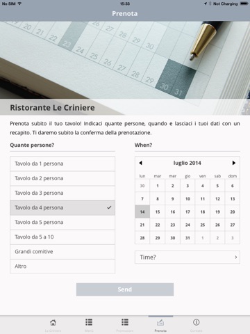 Grazie a questa applicazione potrai conoscere tutti i servizi che offre il Ristorante Le Criniere e vedere le foto degli interni. Potrai consultare un pratico menù con lelenco di molti piatti che prepariamo e prenotare facilmente un tavolo in pochi semplici step!