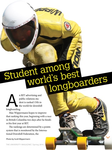 RIT: The University Magazine tells stories about Rochester Institute of Technology’s programs, innovative projects, students and alumni. The magazine, which is published three times a year, is the primary means of communicating with graduates. The free iPad edition includes videos, slideshows, hyperlinks and other multimedia features.
