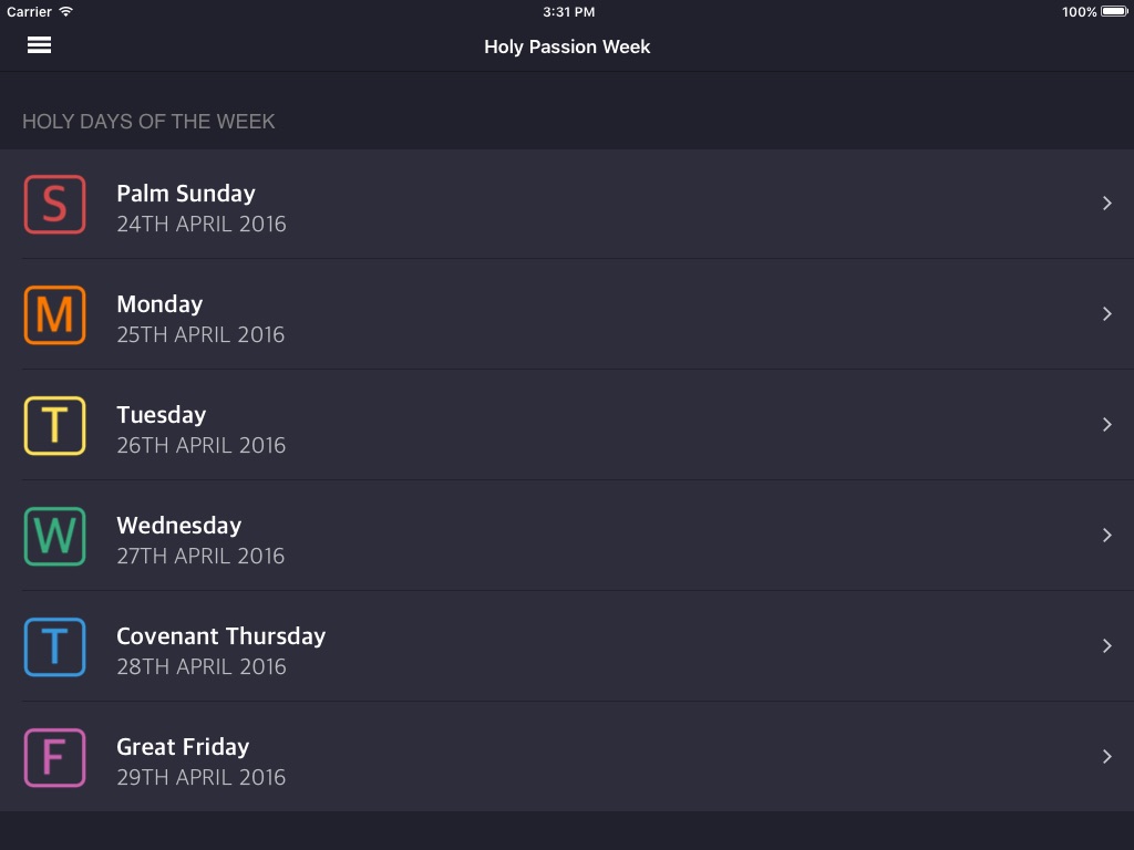 This app contains the entire Passion week schedule.