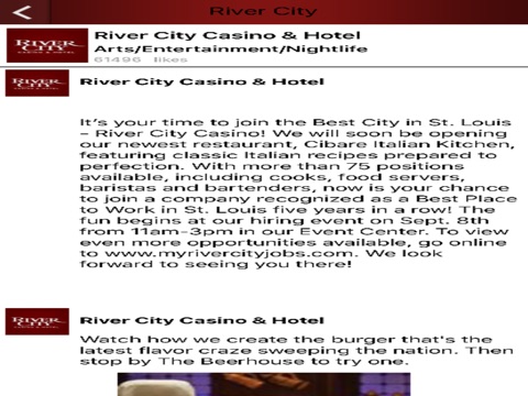 Get the best odds in St. Louis with the official River City Casino & Hotel mobile app! This interactive concierge app gives you on-the-go access to special offers and events, casino and entertainment information, dining menus, directions, weather updates and much more. Take the River City action with you wherever you are!