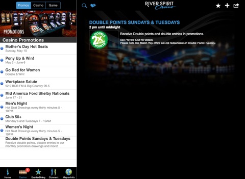 Get your game on with the official River Spirit Casino mobile app! The app comes packed with dynamic features to enhance your experience at River Spirit Casino before, during and after your visit. Use it to unlock special promotions, view the latest entertainment schedule, get GPS and indoor wayfinding directions, find out places to explore in the area, provide instant feedback and ratings on services!