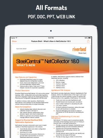 Every day, on the average, sales reps spend 60 minutes waiting. They wait in line at a coffee shop. They wait for a train. They wait for a customer running late. They wait in the airport check security lines. What if they could use the waiting time (instead of wasting it checking Facebook) to read the latest product datasheet, learn about pricing updates or simply share a PowerPoint presentation with the prospect from their iPad? RiverDoc makes sales reps as productive on the go as they are at the office.