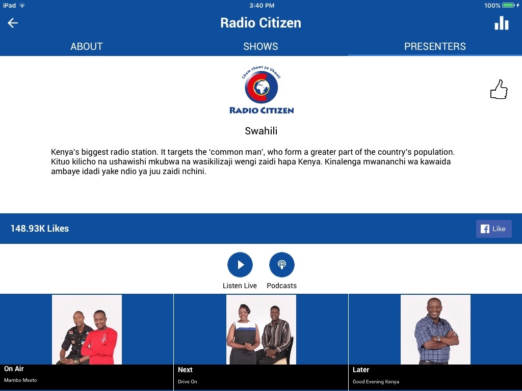 With Citizen Radio app, you can listen to Radio Citizen, Hot 96 FM, Ramogi FM, Inooro FM, Egesa FM, Mulembe FM, Bahari FM, Sulwe FM, Chamgei FM, Wimwaro FM, Musyi FM, Muuga FM and Vuuka FM.
