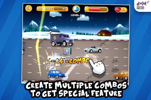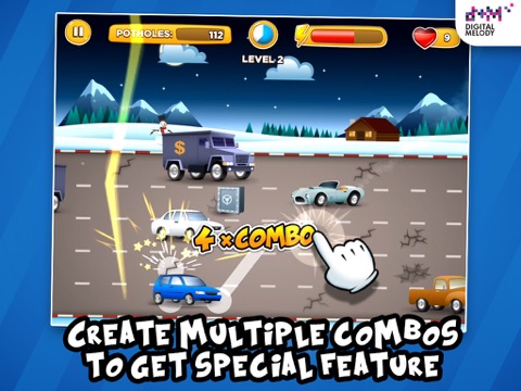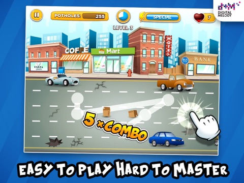 Roadfix Rush Deluxe is an addictive arcade-style game in which you will have to fix potholes by tapping or sliding your fingers on the screen to avoid cars being crashed.