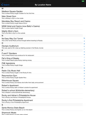 This is the Ultimate Rocky Movie Filming Location Finder Application for all fan enthusiast and tourist. Our application contains address information on over 50 Rocky Movie filming locations in the surrounding areas of Philadelphia, Pennsylvania. At a touch of a finger, you can easily find Rocky Movie filming locations which includes houses, offices, parks, street corners, restaurants, private and public businesses in the city of Philadelphia, Pennsylvania.