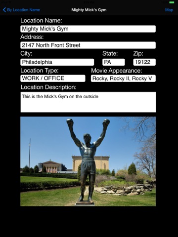 In addition, the application provides a robust mapping function which uses the selected filming address to assist you in finding your desired Rocky Movie location. The mapping function is very helpful in allowing the user to find any filming location in an unfamiliar part of the city of Philadelphia, Pennsylvania.