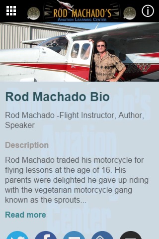 Rod Machado’s Aviation Learning Center App offers a single source location to receive educational aviation information provided by flight instructor, speaker and author: Rod Machado. This app includes free access to Rod’s aviation training videos, Rod’s audio and video and text blogs, reading recommendations, social site connections (Facebook, Twitter, Instagram), recommended aviation links, Rod’s speaking schedule and locations, access to Rod’s product store and product information, Rod’s CFI affiliate program, articles about learning to fly and becoming a pilot, access to Rod for questions you might have about flying, and much more.