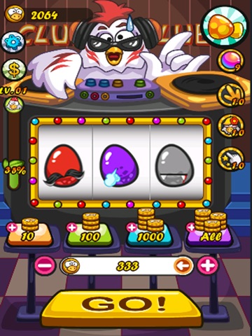 -Eggs are rolling in the slots with background of DJ hens.
