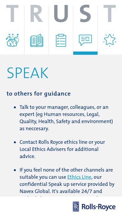 This app is for both Rolls-Royce plc employees as well as our customers, suppliers, stakeholders and investors and contains a copy of the Rolls-Royce Global Code of Conduct and a link to our Ethics Line to encourage speaking up.