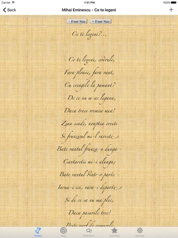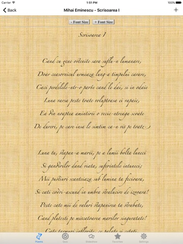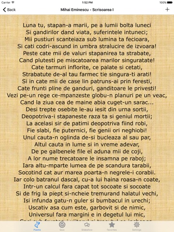 Romanian Poems has a very large collection of poems, almost 600. Sometime you will be speechless to share your feeling with your love ones. Sometimes you have lots to speech to your love but still not able to say a single world. Sometimes you do not know what to tell your love when she looks so beautiful. And you can use this app to help you.