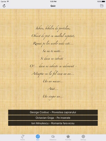 Application géniale qui offre un panel de poètes roumains important mais limité du fait des droits dauteurs. Poèmes traduisibles en plusieurs langues même si en littérature et surtout en poésie, la traduction est une trahison !! Jattends avec impatience lintegration de stanescu et blaga